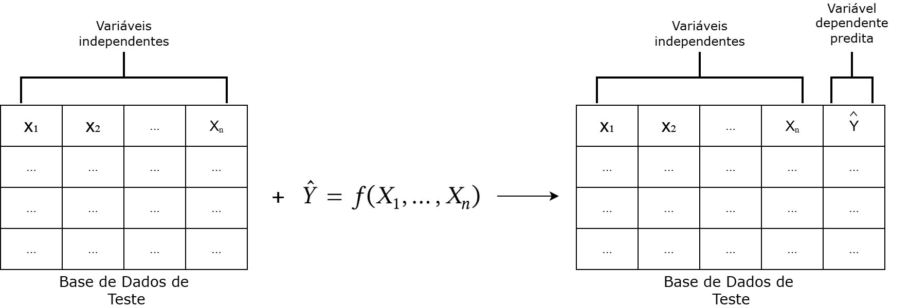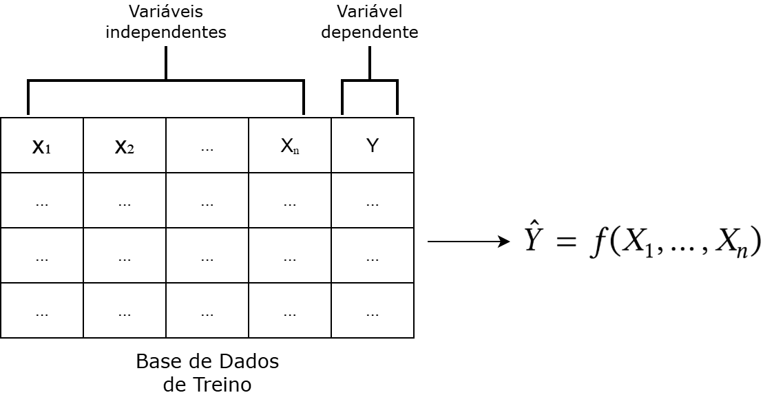 Na dedução, por sua vez, partimos de uma relação pré-definida entre as variáveis para, a partir do valor de uma ou mais variáveis, inferir o valor de alguma outra variável de interesse para um determinado ponto ou conjunto de pontos (Vapnik, 2000). Ou seja, a partir da relação \(\hat{Y} = f(X_1, \ldots, X_n)\), e do conhecimento do valor de \(\{X_1, \ldots, X_n\}\), deduzimos o valor de \(Y\) ou, no caso, apresentamos uma estimativa \(\hat{Y}\) para \(Y\) (Figura 17.3).