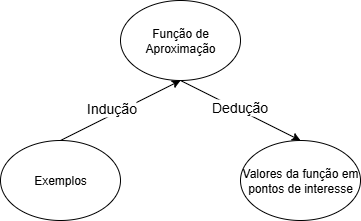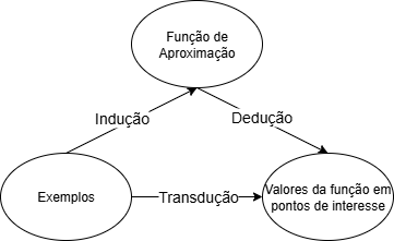 Para entender o aprendizado transdutivo, é necessário antes entender a diferença entre dedução e indução como formas de inferência, e como essas são usadas dentro do aprendizado supervisionado (ver (Russell; Norvig, 2009)). Na indução, uma relação (em geral, uma função) entre variáveis é derivada a partir dos próprios dados (Vapnik, 2000). Assim, ao vermos, por exemplo, determinados valores para um conjunto de variáveis \(\{X_1, \ldots, X_n\}\) em conjunção com determinados valores para uma variável \(Y\), induzimos uma relação \(\hat{Y} = f(X_1, \ldots, X_n)\) entre elas1, conforme ilustra a Figura 17.2.