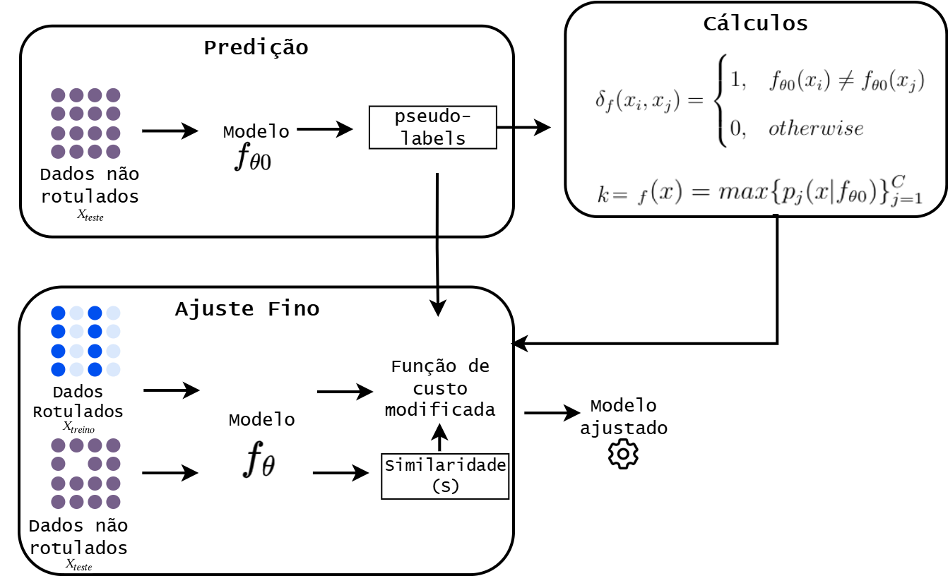 O passo seguinte consiste na modificação da função custo usada no ajuste fino do modelo \(f_{\theta}\), ou seja, durante o ajuste fino, a função de custo é adaptada para incluir um termo adicional correspondente aos exemplos não rotulados. Esse termo transdutivo leva em conta a similaridade \(S\) entre exemplos, a confiança \(k\) do modelo nas predições e a consistência \(\delta\) entre os pseudo-rótulos gerados. Em geral, esse termo tem um peso menor em relação ao erro supervisionado, controlado por um hiperparâmetro de regularização \(\lambda\). Dessa forma, três pontos principais são considerados para o cálculo do termo transdutivo na função de custo: