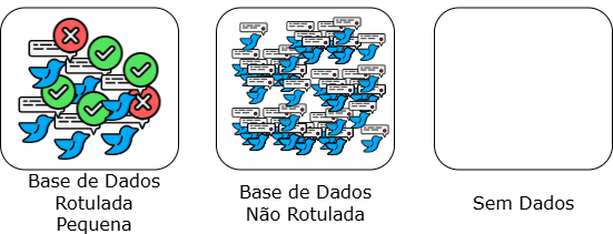 Como exemplo, imagine que você se interessa por uma tarefa de classificação de tweets. Nesse caso, todas as situações acima são possíveis de acontecer, vista a popularidade desse tipo de dado. No primeiro caso, você pode ter tido sorte e encontrado uma base de dados anotada com os rótulos do seu interesse (por exemplo, a base de dados DANTEStocks, descrita em (Di Felippo et al., 2024)). No segundo caso, você pode ter encontrado a base de dados ou implementado um crawler pra coletar os tweets da sua preferência, mas os rótulos não existem. No pior cenário, você não possui nem mesmo os tweets de interesse.