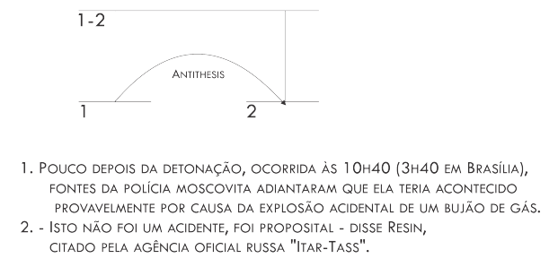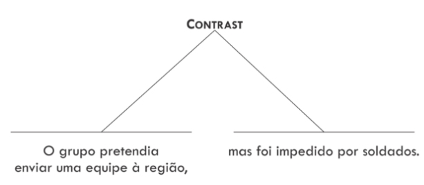 Na Figura 11.2, apresenta-se um exemplo da relação mononuclear Antithesis, em que os segmentos 1 e 2 não podem ser válidos ao mesmo tempo, pois, ou a “detonação” foi “acidental” ou “proposital”. O segmento 2 é nuclear. Para que a crença do leitor no segmento 2 seja melhor aceita, o segmento 1 deve ser inválido. Na Figura 11.3 exemplifica-se a relação multinuclear Contrast.