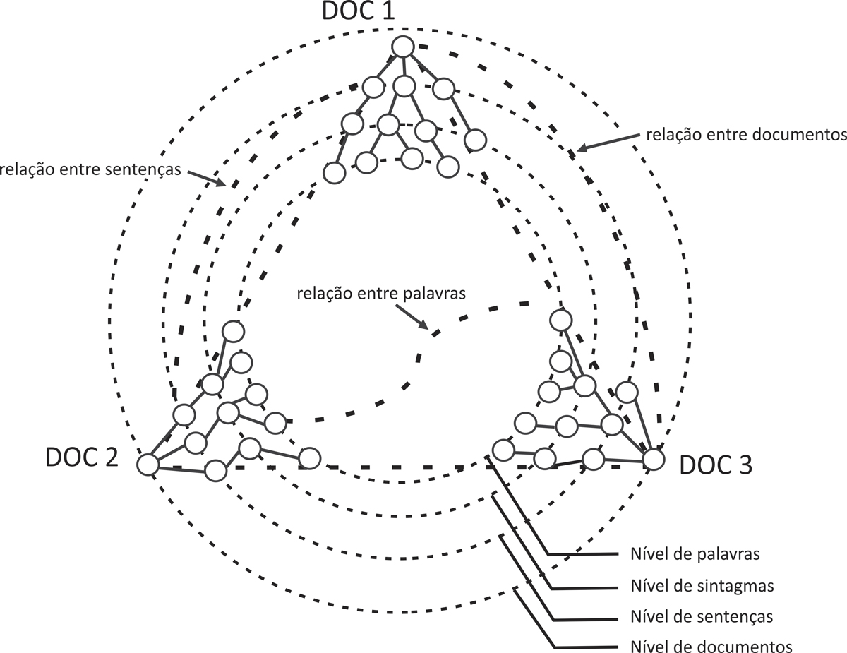 Na Figura 11.4, percebe-se que os níveis nos quais as relações CST podem ser identificadas compõem uma hierarquia (palavras → sintagma → sentença → texto), ainda que usualmente isso seja feito em nível sentencial. Cada um dos três documentos (DOC 1, DOC 2 e DOC 3) está representado por um subgrafo, que codifica relações internas aos textos. Os relacionamentos internos a cada texto podem ser caracterizados em nível sintático ou discursivo. As relações CST que podem ser estabelecidas nos diferentes níveis estão representadas por linhas pontilhadas mais grossas.