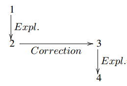 Em (3b), o falante não questiona seu interlocutor sobre sua conclusão (EDU 1), mas expressa discordância em relação à veracidade subjacente àquela conclusão. Isso assume a forma de uma relação de Correction entre a EDU 2 do primeiro falante, em (3a), representando o motivo e o contra-argumento do segundo falante. O falante fornece uma razão adicional para suas crenças por meio de uma relação de Explanation. Na Figura 11.1, tem-se a representação na forma de gráfico para esse diálogo.