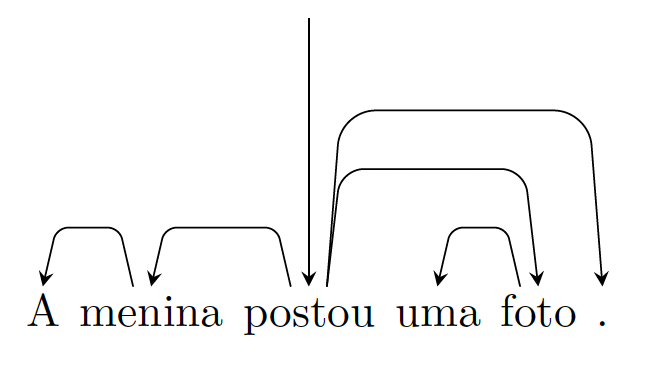 Neste exemplo, foi necessário cruzar os arcos de duas relações porque existe uma relação entre “postou no Instagram” e outra relação entre “foto com filtro”. Para não haver cruzamento de arcos, a sentença teria de ter a seguinte ordem: “A menina postou uma foto com filtro no Instagram.” ou ainda “A menina postou no Instagram uma foto com filtro.”