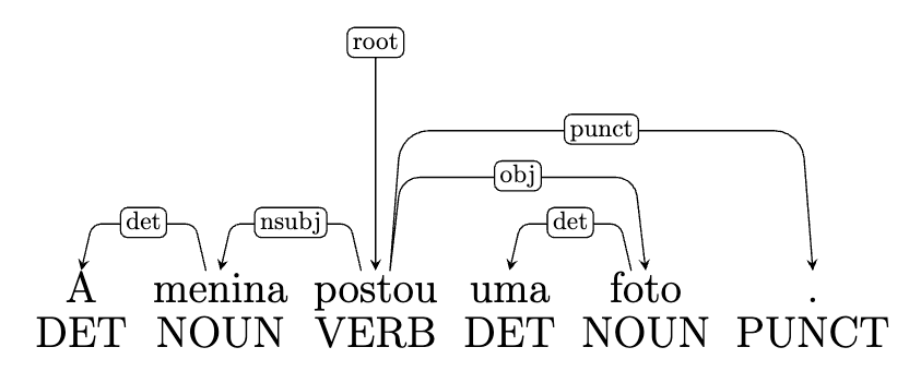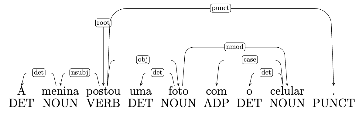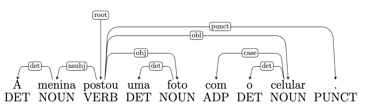 Como vemos na Figura 6.11, a cada palavra é atribuída uma etiqueta morfossintática, indicada em caixa alta na parte de baixo da Figura. A etiqueta que aparece acima dos arcos das setas representa o nome da relação que se estabelece entre a palavra núcleo e a palavra dependente. Essa etiqueta é escrita em letras minúsculas. As etiquetas são selecionadas dentro de um conjunto fechado que varia segundo o padrão de anotação. Na Figura 6.11, o conjunto de etiquetas é o proposto pelo projeto Universal Dependencies, sobre o qual falaremos na Subseção Projetos de anotação multilingue: Universal Dependencies.