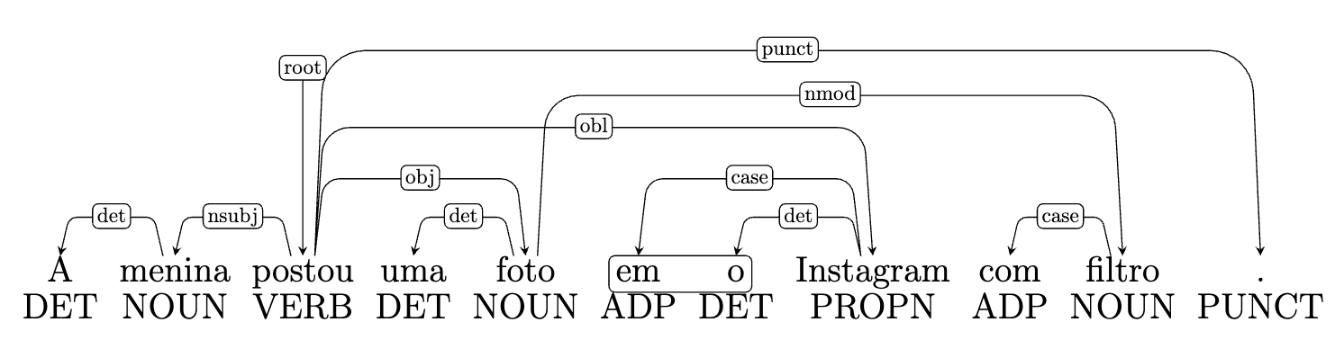A vantagem da representação parentética é que ela é mais fácil de ser implementada, já que está no formato de texto e não depende de softwares de anotação. Por outro lado, a desvantagem é que a visualização da estrutura sintática da sentença, por um humano, é mais difícil do que uma representação por árvore. Na Figura 6.16 temos a representação parentética da sentença “A menina postou uma foto no Instagram com filtro”, na qual há cruzamento de arcos. O cruzamento das relações, claramente visível na Figura 6.14, é mais difícil de ser identificado na representação parentética.