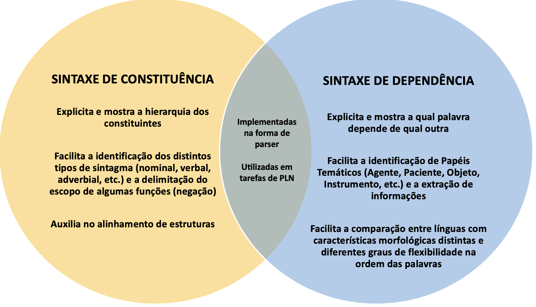Uma vez apresentados os dois tipos de análise sintática mais utilizados em PLN, cabe perguntarmos quais as vantagens e desvantagens de se adotar cada um deles. A Figura 6.19 apresenta uma síntese dos principais pontos de cada tipo de análise sob a perspectiva de seu potencial em projetos de PLN.
