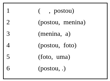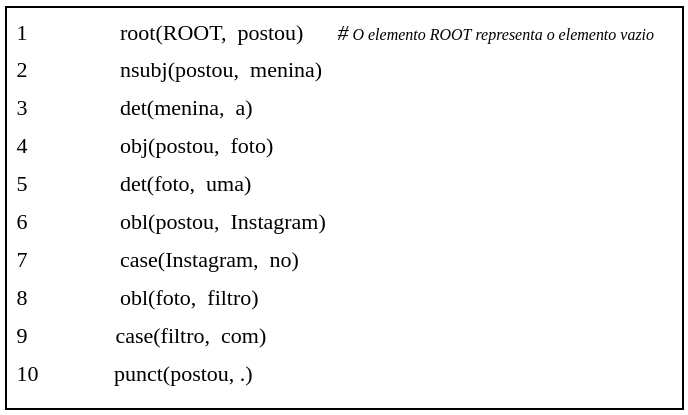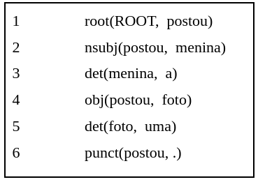 Na linha 1, temos a relação conceitual de root, que é representada pelo elemento vazio, o qual governa o verbo “postou”, considerado o elemento central na sentença. Assim como na representação por setas, temos nas linhas 2, 4 e 6, as relações de dependência em que o verbo “postou” governa seus dependentes “menina”, “foto” e “.”, respectivamente. Na linha 3, vemos a dependência de “a” (dependente) em relação a “menina” (governante), assim como na linha 5, em que “uma” é dependente de “foto”.