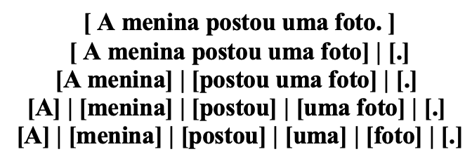 Colchetes (em inglês, brackets) são uma forma de representação hierárquica por meio da qual indicamos quais palavras estão agrupadas dentro de uma mesma unidade e quais unidades são parte de unidades maiores. Por exemplo, a sentença “A menina postou uma foto.” pode ser representada, de forma progressiva, dos constituintes maiores aos menores, como ilustrado na Figura 6.4.