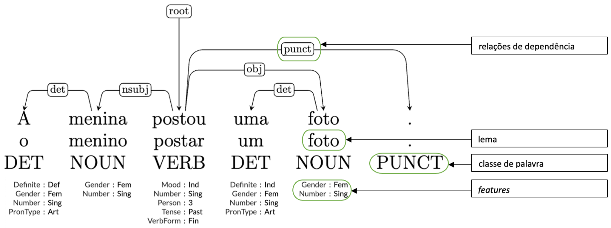 A seta central, que chega no verbo “postou” é apenas uma representação conceitual de que esse é o elemento central da sentença. As setas que saem de “postou” e chegam em “menina”, “foto” e “.” indicam que, nessas relações, “postou” é o pai e “menina”, “foto” e “.” são filhos de “postou”. A seta que sai de “menina” e chega em “a” indica que “a” é filho de “menina”, assim como a seta de “foto” para “uma” indica que “foto” é pai de “uma”.