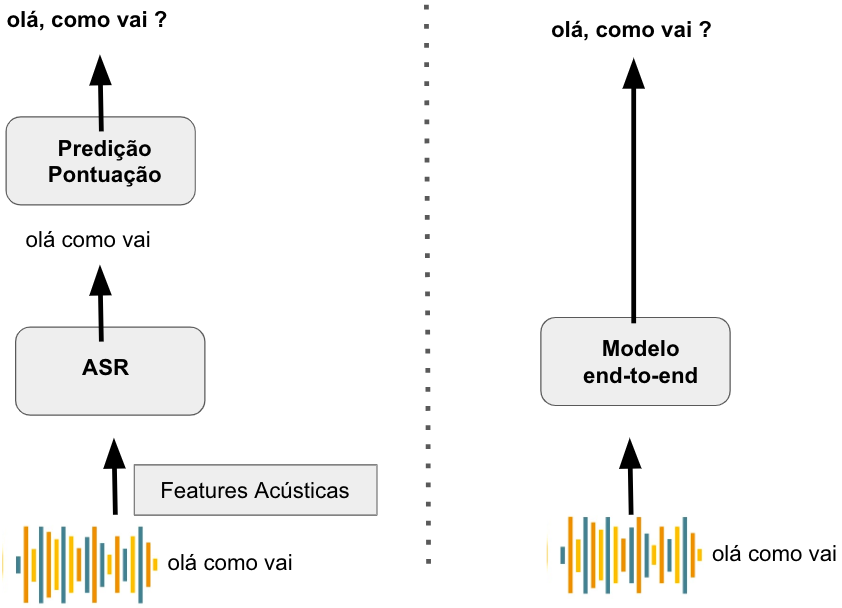A abordagem dominante na literatura, conhecida como abordagem em cascata, é treinar um modelo de reconhecimento de fala (ou usar um pronto) e um modelo de predição de pontuação separadamente, e, em seguida, colocá-los em cascata, ou seja, inserir marcas de pontuação na transcrição gerada pelo ASR como uma etapa de pós-processamento. Para cada token na saída do ASR, as features acústicas do áudio são obtidas e são usadas como entrada para o módulo de predição de pontuação (Figura 3.6, esquerda).