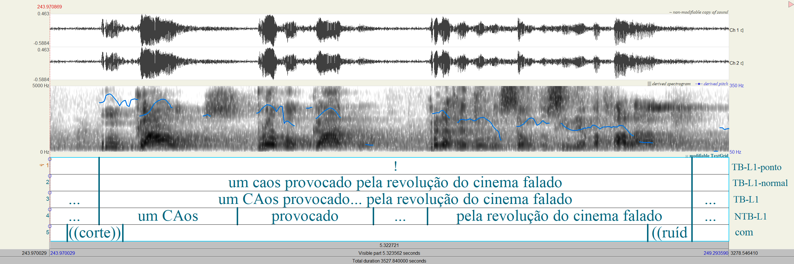 - 2 camadas (tb-, ntb-) nas quais a fala de cada locutor (-l1, -l2) e documentador (-doc1, -doc2) é segmentada em unidades prosódicas e transcrita de acordo com normas adaptadas do Projeto NURC.