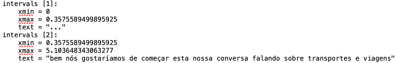 O alinhamento de um trecho de áudio com a transcrição correspondente indica o tempo de início e o tempo final do trecho (também chamado de minutagem do áudio) (veja a Figura 3.1), formando pares usados no aprendizado supervisionado de um modelo de reconhecimento de fala. O reconhecedor Whisper10 da OpenAI, por exemplo, foi treinado dessa forma. O uso de pares áudio-transcrição para treinamento de reconhecedores de fala não é a única abordagem para a tarefa, que também pode ser feita por aprendizado não supervisionado, como é o caso, por exemplo, do wav2vec-U11. Essa é uma abordagem na qual o aprendizado dispensa a necessidade de transcrições, e ocorre apenas por meio de áudio. Em todo caso, para a avaliação do desempenho de um reconhecedor, é importante que haja os pares áudio-transcrição.