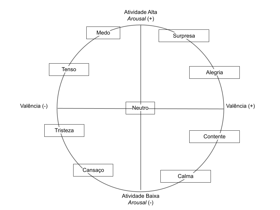 Recentemente, outras teorias e modelos têm sido propostos, obtendo-se um espectro mais detalhado de emoções. Nesse sentido, o Modelo Circumplexo de Russel (Posner et al., 2005) oferece uma perspectiva complementar, ao representar as emoções em um espaço bidimensional, com eixos de valência (positivo/negativo) e intensidade (ativa/passiva), conforme apresentado de forma simplificada na Figura 3.4. Reconhecer emoções na fala tem muitas aplicações práticas, como a análise de atendimento ao cliente, apoio na avaliação do estado emocional de indivíduos durante terapias, e o desenvolvimento de assistentes virtuais mais empáticos, o que ajuda a desenvolver técnicas mais eficientes para interação humano-computador (Wani et al., 2021).