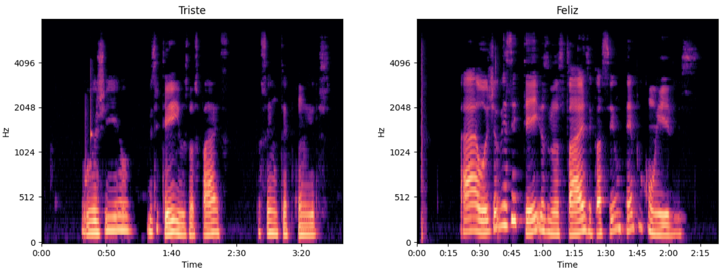 Há três grandes desafios em tarefas de reconhecimento de emoções a partir da fala. O primeiro desafio consiste em representar a fala de forma computacionalmente viável, transformando o sinal acústico em representações que contenham características relevantes para identificar as emoções contidas no sinal. Nesse contexto, uma estratégia tradicional é processar o sinal de áudio para identificar características prosódicas (Rao et al., 2013), como duração e intensidade da fala. Por exemplo, nota-se maior intensidade vocal na emoção “alegria”, enquanto a “tristeza” costuma ter intensidade vocal reduzida. Outra estratégia é o reconhecimento de emoções por meio de espectrogramas (Özseven, 2018), uma representação visual do espectro de frequência de um sinal de áudio ao longo do tempo, obtidas por meio da aplicação da transformada de Fourier em janelas de áudio. Na Figura 3.5, há a ilustração de dois espectrogramas que representam o sinal acústico do texto “hoje eu visitei os meus pais e passei um tempo com eles”, falado por uma mesma pessoa. No lado esquerdo, o trecho foi falado com a emoção “triste”. No lado direito, a mesma sentença foi falada com a emoção “alegre”. Os modelos de aprendizado de máquina exploram as características extraídas dos espectrogramas para aprender a diferenciar as categorias de emoção.