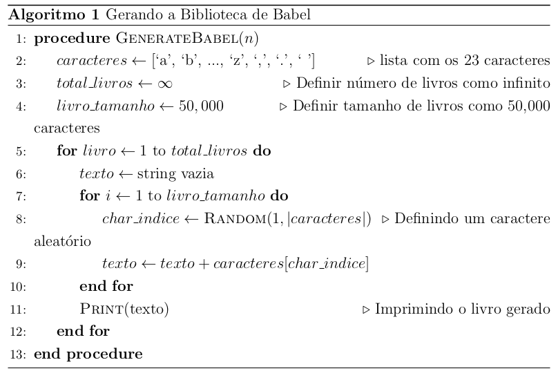 Em teoria, tal questionamento pode ser facilmente respondido através de um algoritmo simples (mas pouco elegante e eficiente) como o representado no algoritmo da Figura 13.22, capaz de gerar (em um tempo infinito) tal biblioteca com livros de até 50 mil caracteres.