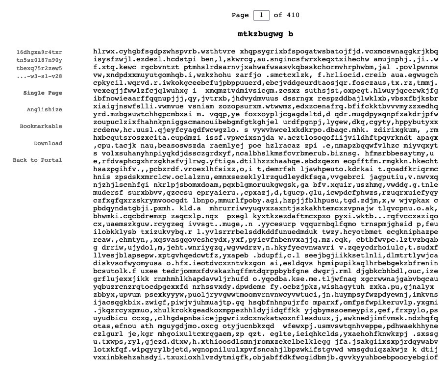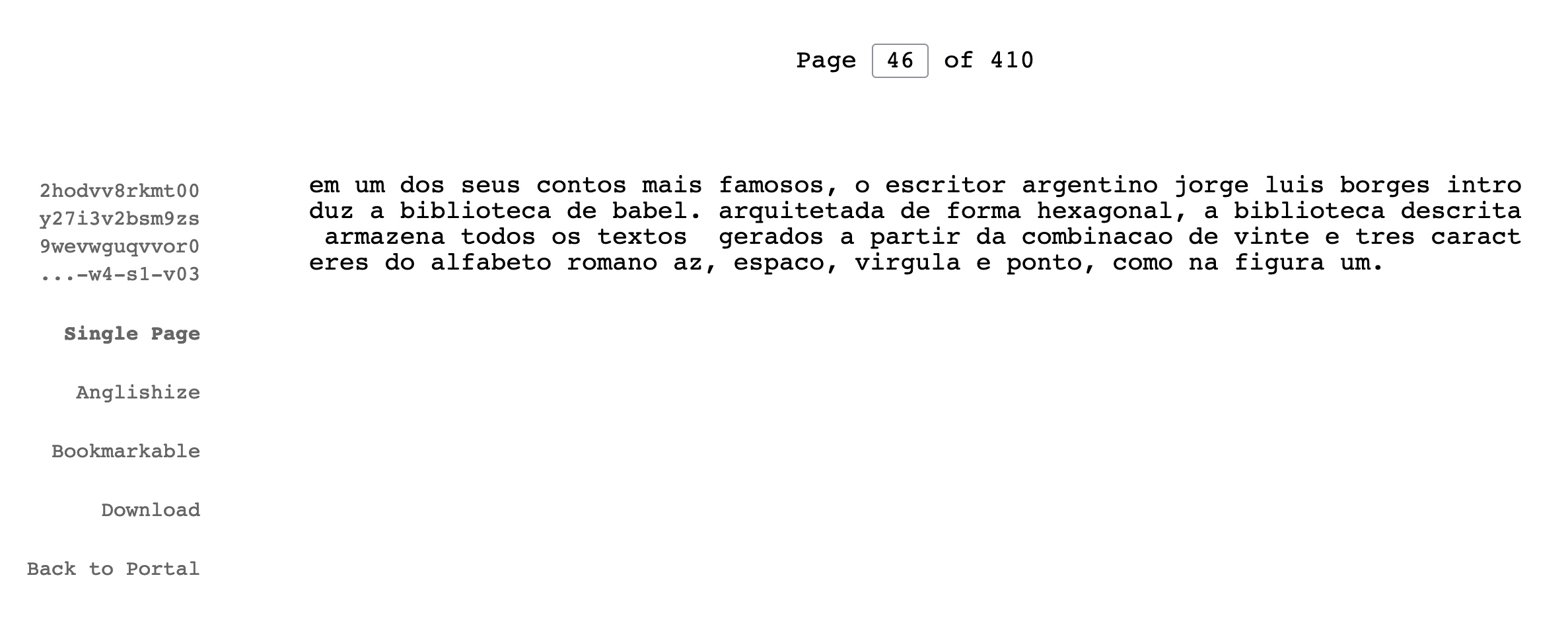 Um exemplo mais elaborado é o gerado pelo projeto The Library of Babel3 que, de fato, disponibiliza uma variação da biblioteca descrita pelo autor argentino. De maneira digital, o projeto disponibiliza uma biblioteca de câmaras hexagonais, cada uma com 4 paredes de estantes, cinco estantes por parede e 32 volumes por estante. Cada volume consiste em um texto de 410 páginas representando combinações dos 23 caracteres. O projeto, que talvez seja a melhor concretização da ideia de Borges, nos permite buscar por trechos de até 3200 caracteres, como, por exemplo, uma versão representada em 23 caracteres do parágrafo anterior, presente na página 329 do volume 26 da quinta estante da quarta parede de uma das câmaras hexagonais da biblioteca (Figura 13.1). Páginas aleatórias também podem ser acessadas, como a disponibilizada na Figura 13.3, representando uma combinação completamente aleatória e sem sentido. Tal exemplo nos permite apontar uma das deficiências desta biblioteca: apesar de armazenar todo o conhecimento presente em todos os livros que já ou ainda serão escritos, estes se encontram entre uma vasta gama de conteúdo sem sentido. Neste contexto, como encontrar e catalogar os textos que, de fato, contêm um significado?