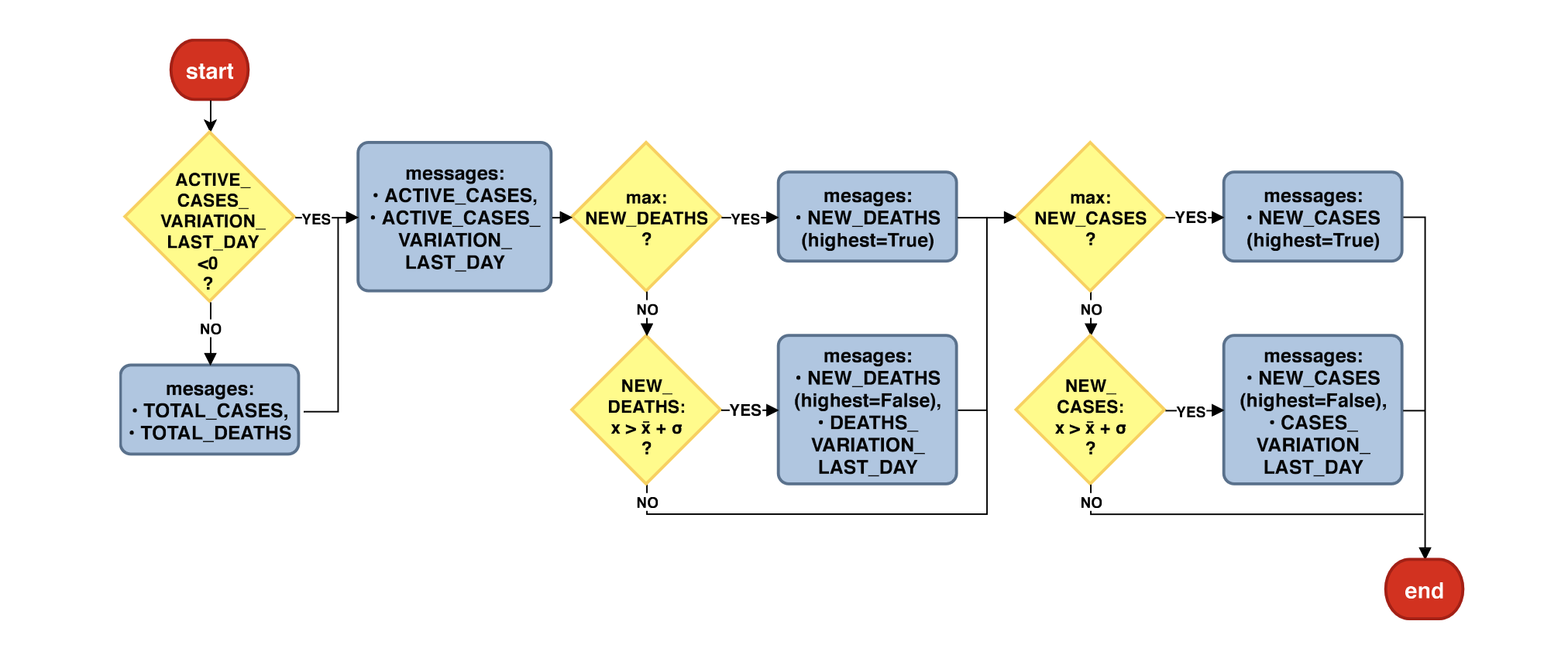 Por fim, o número de novos casos é analisado da mesma maneira que o número de novas mortes. Caso o número de casos ativos seja o maior da série histórica, esta mensagem é selecionada com um atributo que aponta para a ordem de grandeza: NEW_CASES(cases, highest=True). Caso contrário, o módulo checa se o número de casos ativos é maior que a média de casos mais o desvio padrão da série histórica. Em caso positivo, as mensagens correspondentes ao número de casos ativos no dia ((NEW_CASES(cases))) e a variação (CASES_VARIATION_LAST_DAY(variation, trend=high)) são selecionadas.