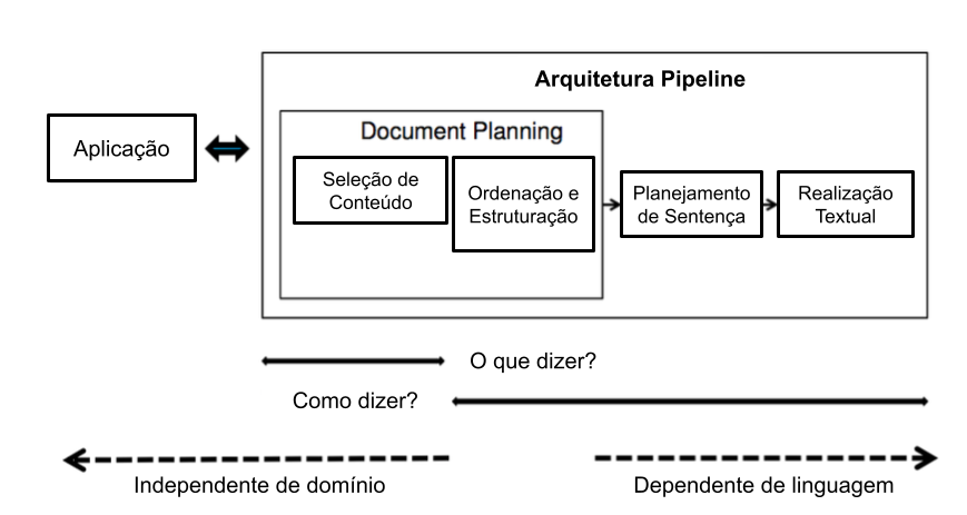 Até recentemente, a arquitetura pipeline era a mais popular na geração de linguagem natural, fazendo com que esta abordagem tenha sido aplicada na geração automática de textos de diversos domínios, como nos esportes (Lee et al., 2017; Theune et al., 2001), previsão do tempo (Goldberg et al., 1994; Sripada et al., 2004), previsão de polenização (Turner et al., 2006), resumos de mergulhos autônomos (Sripada; Gao, 2007), descrições de eventos em turbinas a gás (Yu et al., 2007), informações do mercado de ações (Kukich, 1983), auxílio no tratamento do tabagismo (Reiter et al., 2003), relatórios de cuidados intensivos neonatais (Portet et al., 2009; Reiter, 2007), geração de dados enciclopédicos (Androutsopoulos et al., 2013; Duma; Klein, 2013) e de notícias (Campos et al., 2020; Teixeira et al., 2020).