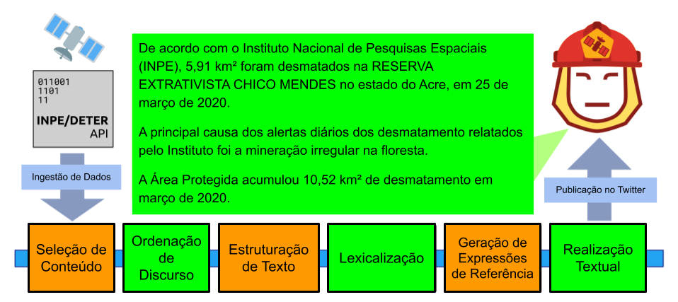 Mais recentemente, Castro Ferreira et al. (2019) propuseram uma versão adaptada da arquitetura pipeline de Reiter; Dale (2000) onde cada módulo é implementado com o uso de redes neurais. A proposta converte uma representação não-linguística de entrada em texto a partir de seis etapas sequenciais: Seleção de Conteúdo, Ordenação de Discurso, Estruturação de Texto, Lexicalização, Geração de Expressões de Referência e Realização Textual. A Figura 13.6 mostra o robô-jornalista “DaMata”, desenvolvido a partir da arquitetura pipeline de Castro Ferreira et al. (2019) para cobrir o desmatamento na Amazônia Brasileira.