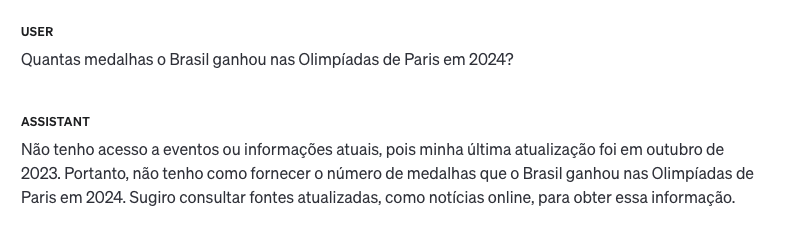 Uma das principais limitações das IAs Generativas é o fato de não terem informações atualizadas. Como exemplificado na Figura 13.13, ao perguntar sobre o número de medalhas que o Brasil ganhou nas Olimpíadas de Paris em 2024, o modelo GPT-4o informaria que não possui esta informação, já que seu último treinamento data de Outubro de 2023.