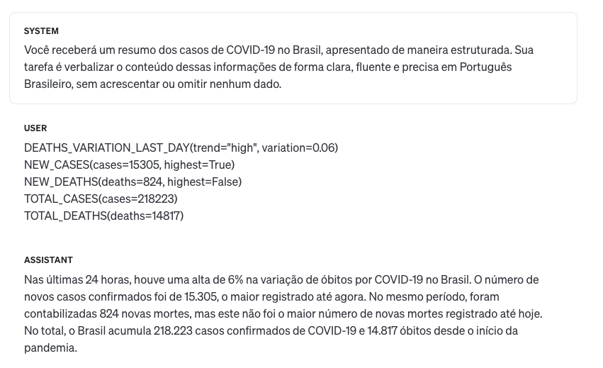 Como pode ser visto na Figura 13.12, neste caso o conteúdo selecionado é dado como entrada para o modelo, antecedido por uma mensagem de sistema instruindo-o como processá-la. Esta instrução explica o domínio e contexto da entrada fornecida (e.g. resumo dos casos de COVID-19 no Brasil) e como a mesma deve ser processada (e.g. converter o conteúdo em um texto em português claro, fluente e preciso). A representação estruturada de entrada consiste nas mensagens selecionadas a serem verbalizadas, cada uma formatada com um predicado identificador do tipo da mensagem (pe. NEW_CASES, NEW_DEATHS) juntamente com seus atributos e respectivos valores (e.g. cases=15035 etc.). A saída gerada pelo modelo é apresentada no parágrafo Assistant na mesma figura. Seguindo a instrução de sistema, o modelo de linguagem é capaz de verbalizar o texto resultante em português brasileiro de maneira fluente e adequada, mesmo com a representação semântica de entrada tender à língua inglesa.