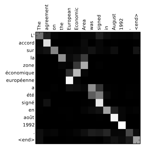 A Figura 13.10 mostra o mapa de calor dos pesos de atenção ao traduzir uma sentença do inglês para o francês. Observa-se neste exemplo como um maior peso de atenção ao token de entrada agreement é dado ao gerar o token accord em francês. Nas avaliações conduzidas, Bahdanau et al. (2015) mostram como o mecanismo de atenção aumenta significativamente a adequação e fluência das traduções.