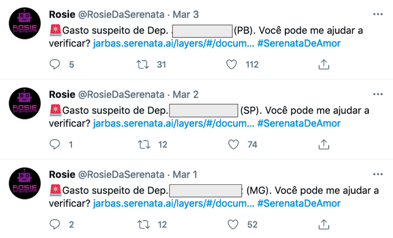 A Figura 13.413 mostra exemplos de publicações feitas pelo sistema Rosie, robô que analisa e identifica suspeitas em gastos de deputados federais em exercício de sua função no congresso brasileiro.